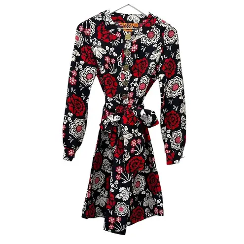 Elegant and timeless, this Tory Burch silk dress features a striking red, navy, and ivory floral pri... Show more