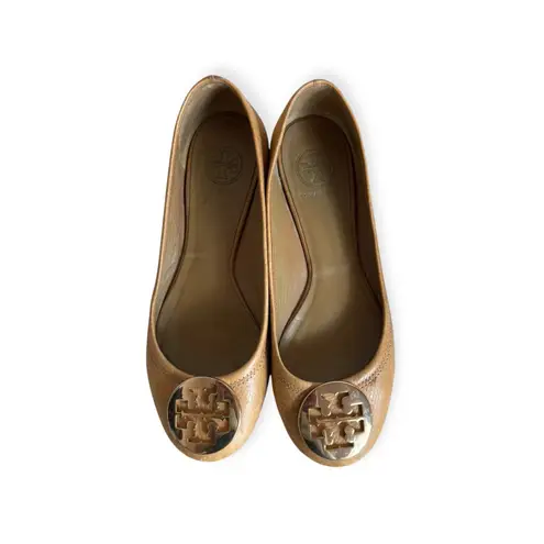 Tory Burch Reva ballet flats in tan pebbled leather with signature oversized gold logo medallions. C... Show more