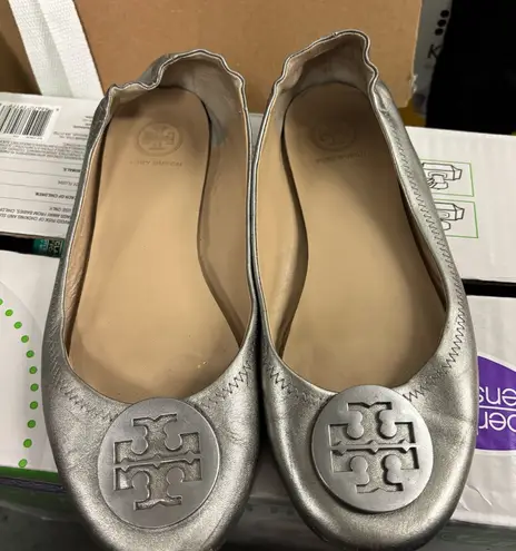 Tory Burch Silver Flat Toy Burch logo Slip on Size 8 There is wear but still has life in them purc... Show more