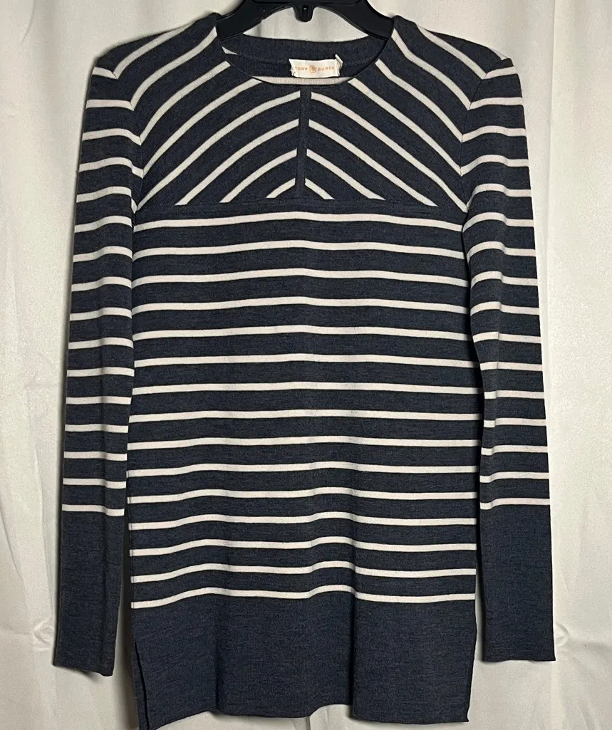 Excellent condition, like new. Tunic length with side slits. Gray with cream stripe