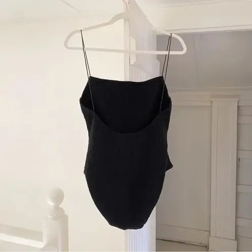 Toteme solid, spaghetti strap, square neck, one piece smocked swimsuit in color, ‘Black’. Sun-protective, technical stretch jersey fabric construction in an allover shirred, smocked design. Thin elasticized spaghetti straps. Square neckline & low scoop back. Fitted silhouette. Pull-on styling. Size XL. Excellent condition. Front: 80% polyamide-recycled, 20% elastane Bust: 30.5” Length: 29.5” --- K5287
