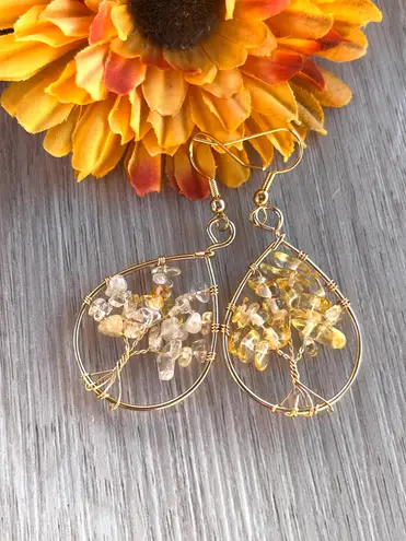 Tree of Life Natural Citrine Chip Gemstone Gold Wire Wrap 2” Drop Earrings Yellow - $19 - From D