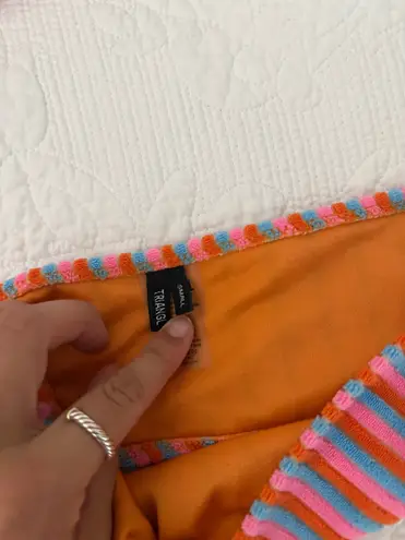 Cute triangle striped swimsuit size small! I can’t tell if any fading but it’s been worn!!