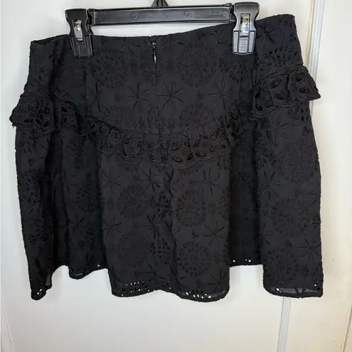 Chic black eyelet mini skirt with ruffle detail. Perfect for casual outings. 100% cotton Made in In... Show more