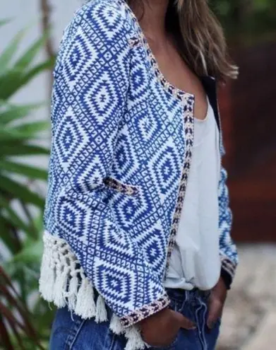 - like new - blue and white diamond print - crochet fringe - size medium - pet free smoke free home
