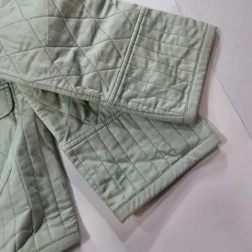 Self: 100% cotton Padding: 100% poly Dry clean only Open front Front flap pockets Quilted fabric Imp... Show more