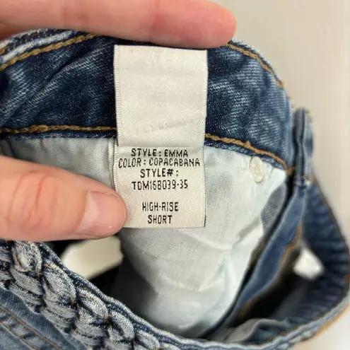 • distressed • raw hems • medium blue denim • braided waistband • zip and button closure • 100% co... Show more