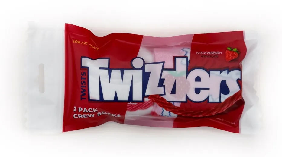 TWIZZLERS TWISTS CREW SOCKS • Brand new with tags • Womens shoe sizes 5-10 • Crew height • 1 pair - white, red - Twizzlers logo and Twizzlers candy graphics • 1 pair - pink, red - Twizzlers logo and strawberry graphics • Novelty Twizzlers candy packaging • 98% polyester, 2% spandex