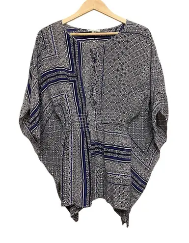 Tyler Boe kimono half sleeve empire waist top with tie neck with tassels. Blue and white mixed geometric print. 100% silk. Smocked elastic under best and on back. Flowy. In good used condition. Size women large Measurements (in inches): Length 25 Measurements are approximate. Check out my other listings and bundle items to save on shipping! tags: boho, silk, tassels, kimono, flowy, resort, hippie, fairy, beach, lightweight