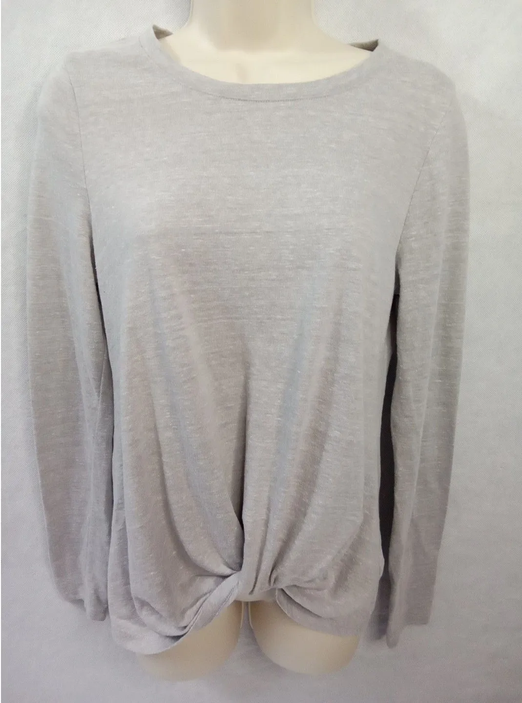 Ultra Flirt women's medium Gray long sleeve Knotted front pullover round neck top. This top is made of 50% polyester 12% rayon 38% cotton and is machine washable. This is a pre-owned item in good used condition no notable damage or stains. All measurements are done with item laying flat. Pit to pit 18" Shoulder 15" Length 25" 0173