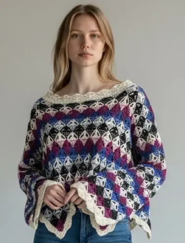 Cozy and boho-inspired, this multicolor crochet knit poncho is perfect for fall and winter layering. Features a scalloped hem, wide sleeves, and soft acrylic-feel yarn in shades of cream, blue, black, gray, and berry.