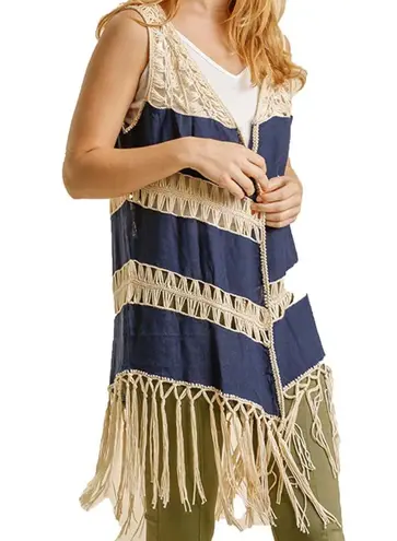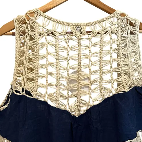 Brand new, with tags Crochet lightweight sleeveless duster Linen blend blue with cream crochet tiers... Show more