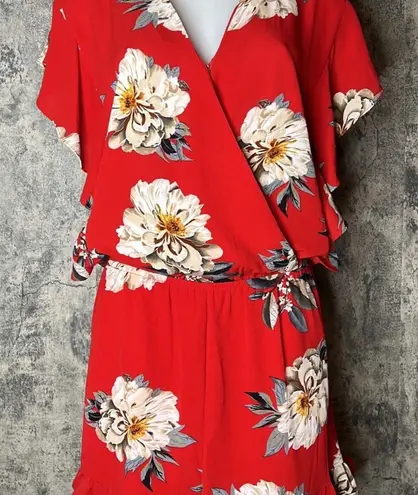 Umgee | Red Floral Faux Wrap V Neck Flutter Hem Shorts Romper Women's 36” Long 24”pit to pit