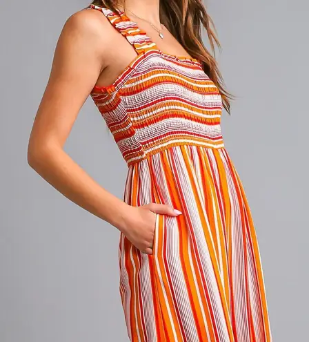 Vibrant Umgee jumpsuit with red, orange, and white stripes. Paired with a sheer lace kimono. Perfect... Show more