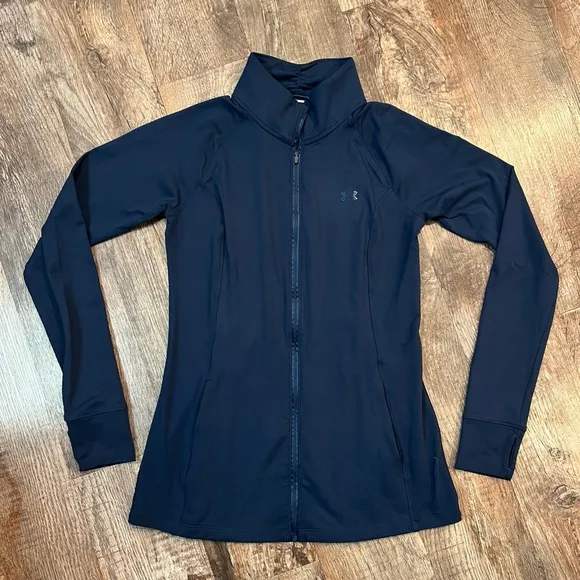 Navy blue women’s Under Armour fitted full zip up jacket. Light weight with mesh inserts on the back... Show more