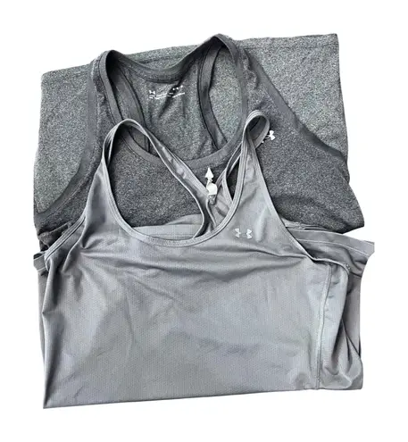 Elevate your workout wardrobe with this Under Armour tank top lot. These athletic racerback tank tops are designed for performance and comfort, perfect for any fitness activity. The gray color offers a sleek and versatile look, easily paired with any workout bottoms. Experience the freedom of movement and breathability during your most intense sessions. Ideal for gym workouts, running, or yoga sessions, these tank tops will keep you cool and stylish.