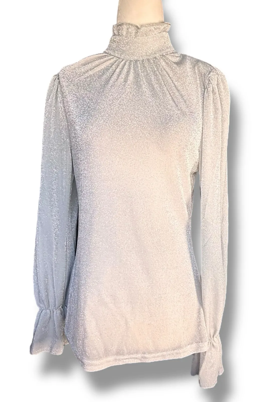Unique Vintage metallic silver shimmer blouse High mock neckline with subtle ruffle trim Gathered shoulders and long bishop sleeves Elastic cuffs with flared wrist detail Semi-sheer shimmer stretch fabric Keyhole back with three-button closure Slim feminine fit through the body New With Tags Women’s size Medium (6–8) Flat Lay Measurements 17 inches pit to pit 26 inch length Elegant disco glamour shines in this timeless shimmer blouse
