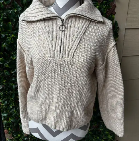 Elegant cream sweater with a cozy cowl neck. Features a stylish zip detail. Perfect for layering.