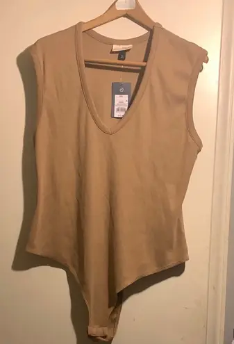 Stylish camel bodysuit with a flattering V-neck. Ideal for layering or standalone wear.