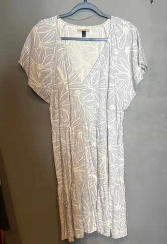 Light blue midi dress with white floral pattern. Short sleeves. V-neck design. Perfect for casual ou... Show more