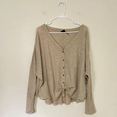 Cozy tan thermal top with button-up design. Features a relaxed fit and tie detail. Great condition!