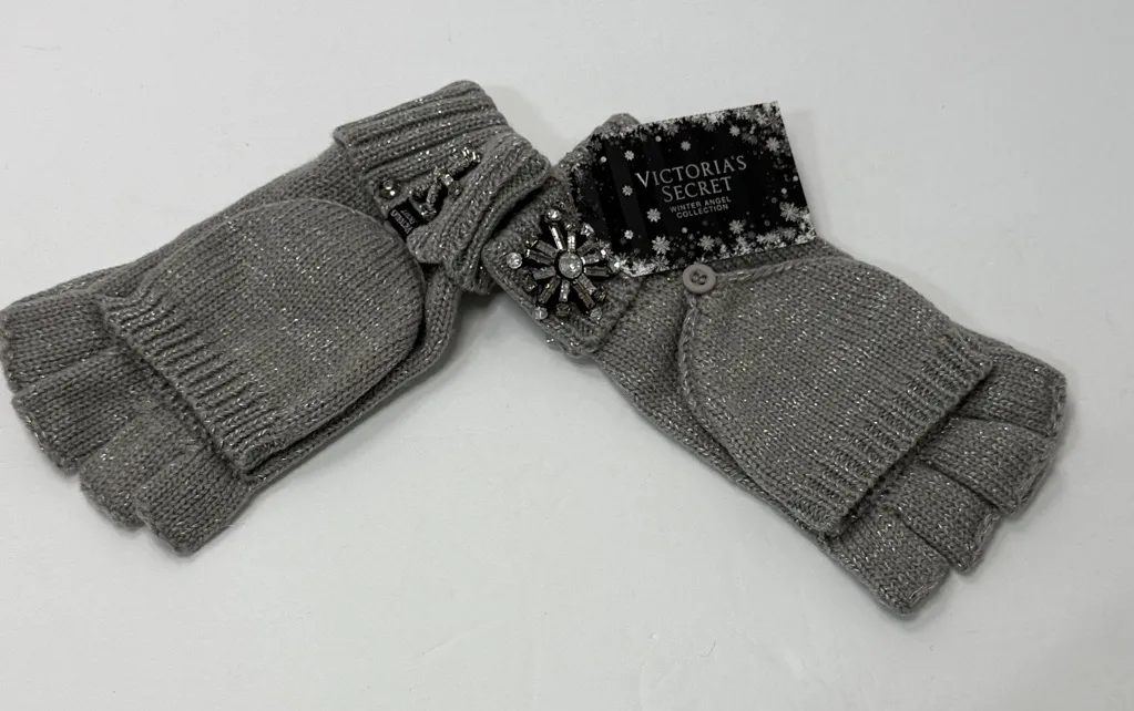 Stylish gray fingerless gloves. Features elegant embellishments. Perfect for adding a touch of glamo... Show more