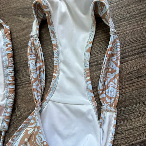 EUC Victoria’s Secret Sequin Damask Bikini Set in Light Blue/Tan/Silver. Top (Size Medium). Bottoms... Show more