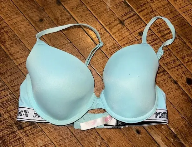 Victoria’s Secret blue, thick band, wear everywhere, T-shirt bra. Minor wash wear. Overall, in good... Show more