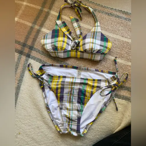 Stylish bikini with a plaid pattern. Features purple, green, and tan hues. Xs most fits S Excellent... Show more