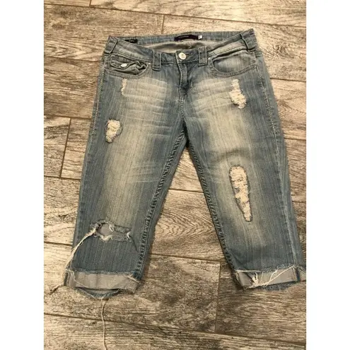 Vigoss capri Denim Jeans size 5 Back Flap Pockets in Light wash with cuffs. Destroyed with torn hole... Show more