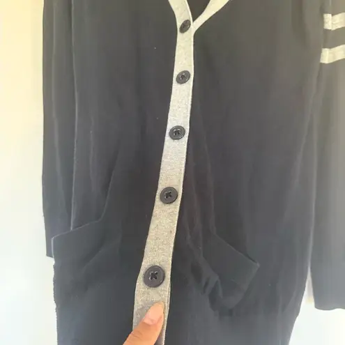 Elegant Vince cardigan in black with gray trim. Features button-down front and striped sleeve detail... Show more