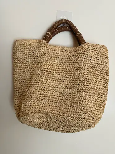 Stylish straw tote with vibrant pom-poms. Ideal for casual outings.