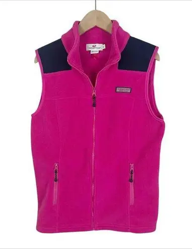 Bright pink with navy blue accents. Zips in front. Two front zip pockets. 100% polyester. No flaws.... Show more