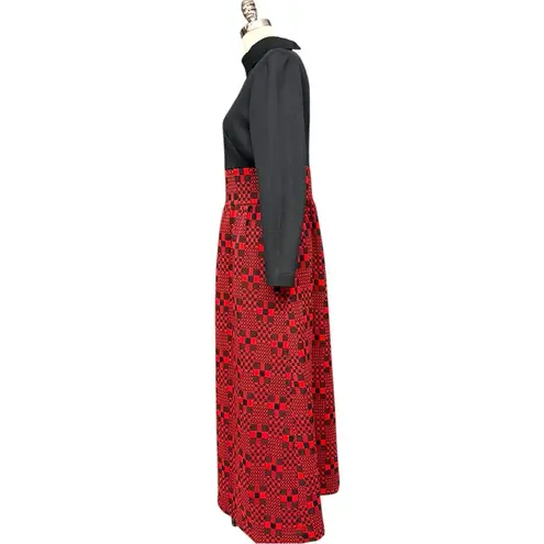 Stunning vintage mod-style maxi dress from the 1970s featuring a solid black textured mock-neck bodice and a bold red-and-black geometric checkerboard skirt. The dress has a high waistline, long sleeves, and a full-length A-line silhouette. Brand: Unbranded (Vintage) Size: Approx. Large (modern 10) Measurements: Length 54”, Pit to pit 21” with 3” dart, Waist 15.5” Material and care: Likely poly-knit blend; medium weight, unlined Condition: Excellent vintage condition; minor expected wear consistent with age vintage mod dress, 1970s maxi dress, geometric checkerboard dress, black red retro dress, vintage Japan zipper, long sleeve maxi, 70s fashion dress, mock neck