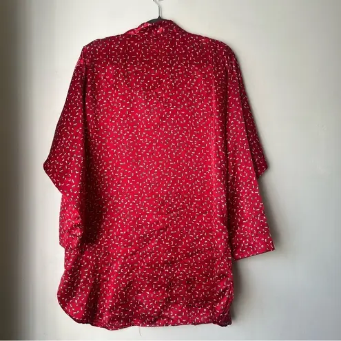 . Red with white, green and purple pattern allover. Silky satin feel. white faux pearl buttons. slit... Show more