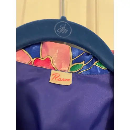 This 1980s Rasee dress showcases a lush floral design against a vibrant blue background. The elegant midi length and nostalgic button-front detail evoke timeless sophistication. • Button-front closure for easy wear • Lightweight fabric with a satin-like sheen • Tropical floral print with bold colors • Short sleeves and V-neckline • Midi length offering a classic fit No visible flaws noted. I don't see a size or fabric tag but assume this is polyester. Size: Womens M See below for approximate measurements: Armpit to armpit 19 in / 48 cm Waist (flat) 13 in / 33 cm Shoulder to hem 43 in / 109 cm