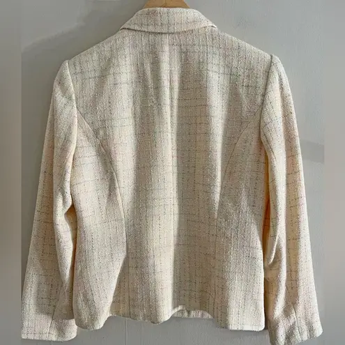 Step into timeless elegance with this vintage 1990s Joan Leslie Classics blazer, featuring a soft buttery yellow tweed accented by subtle pastel rainbow stripes. This blazer is fully lined, with a soft polyester-viscose blend that offers both comfort and durability. Four front buttons and functional pockets add to its practical style. Whether you’re channeling old money aesthetic, styling a coastal grandmother look, or building a retro office wardrobe, this piece layers beautifully for spring and beyond. Shipping This item is shipped simply and sustainably — no excess wrapping, just mindful packaging in a clean poly mailer Size: 8P Color: Yellow with pastel stripes Fabric: 70% Polyester / 30% Viscose Condition: Excellent vintage condition – no stains, holes, or flaws pastel tweed jacket, 90s preppy blazer, careerwear, brunch outfit, Clueless-inspired fashion, French girl style, vintage office look, timeless wardrobe staple, light layering jacket, retro boss babe aesthetic