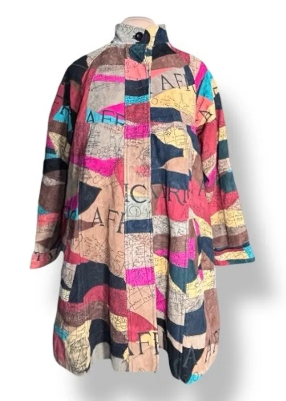 African Star leather coat Vintage long leather jacket with abstract world map print Oversized relaxed silhouette with swing shape Button front closure with stand collar Long sleeves with roomy fit Soft genuine leather exterior Fully lined interior Colors include tan brown black teal red pink yellow and navy Marked free size fits oversized across multiple sizes Would best fit a modern large to XL Made in India Vintage condition One small tear in leather shown in close up photo Light natural wear consistent with age Flat Lay Measurements 22.5 inches pit to pit 34 inch length Bold art teacher statement coat with global map collage art and a 90s vibe