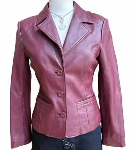 Stylish maroon leather jacket with button closure. Tailored fit and classic design. Ideal for versatile wear. This jacket is beautiful. It is a burgundy color so is great for adding a pop of color to any outfit. It has a button front closure and 2 pockets in the front. 100 % genuine lamb leather. Excellent condition, no flaws. #y2k #vintage #gilmoregirls #90s #genuineleather classic Ralph Lauren Christmas western preppy biker grunge