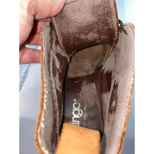 Vintage Dingo western lace-up ankle boots in soft tan suede with decorative stitched scroll details. Classic western pointed toe and stacked block heel (approx. 2.5"). Lace-up front adds versatility and comfort, making them easy to style with jeans, dresses, or festival looks. Preowned with visible wear to soles and insoles, scuffs to suede, and some age patina inside (see photos). Considerable flaking of the coating on the interior suede, but taking a brush to it should clean it up and just leave exposed suede. Tip of one shoe lace end is missing. Still structurally solid and wearable, with lots of character that enhances their vintage western appeal.Perfect for boho, cowgirl, and festival styling. No Size Visible: Measurements: Length (heel to toe): about 10.25" Width (ball of foot): about 3.5" Shaft height: about 4.25" Heel height: about 2" Approx. Women's Size 9 (see measurements to ensure best fit) vintage Dingo boots, suede western ankle boots, lace-up cowgirl boots, tan suede boots, retro boho boots, 80s 90s western boots, festival cowgirl style, pointed toe suede boots, stacked heel ankle boots, Dingo vintage footwear, coastal cowgirl This is a preowned item and may show minor signs of wear. Please review all photos and reach out with any questions or offers! Packaged with care and shipped promptly.