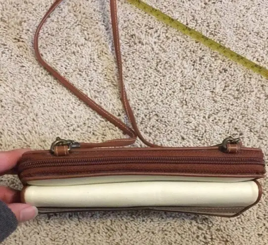 . Multiple marks / flaws on cream part. Interior is in excellent condition. Outer snap closure pocket. Inner zipper pocket has multiple credit card slots. 2 big slots. One zipper pocket. Please see close up pictures
