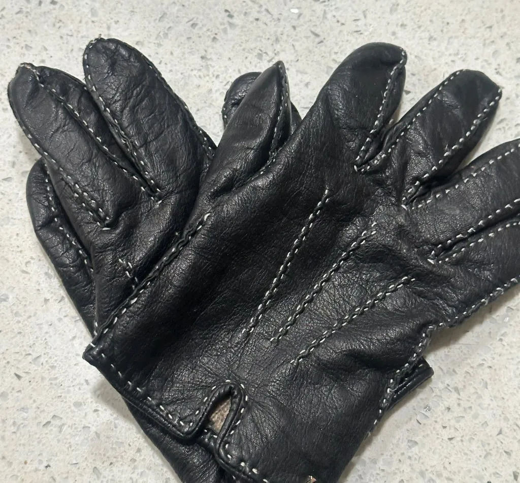 Elegant black leather gloves. Features white stitching detail. Ideal for a sophisticated look also there is liner inside Beautiful vintage lambskin leather ladies driving gloves in almost-black-dark-navy finished with off-white hand saddle stitching. Soft and durable and in excellent vintage condition.