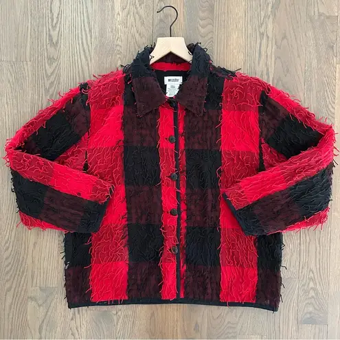 Vintage buffalo check fringed chore jacket. In red and black buffalo check plaid. 100% cotton. Fully... Show more
