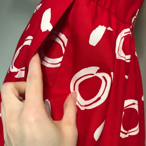 Incredible vintage Lanz one-shoulder dress (estimating from the 60s) with abstract white circles on vibrant red cotton. See detail at shoulder. Pockets in side seams & zipper & hook & eye closure on side. Gently flared skirt. In beautiful shape. In the first photo, the mannequin has dress pinned at waist to show the shape better as the mannequin is a little small for the dress. The second photo is unpinned. Brand: Lanz Originals Size: Tag reads six. Estimating that this would best fit a modern XS. See approx measurements for best fit. Pit to pit: 16” Waist: 14” Length: 43.5” Condition: Good vintage condition. Several minor spots - see example photo Cleaned and from a smoke-free home. Fast shipper!