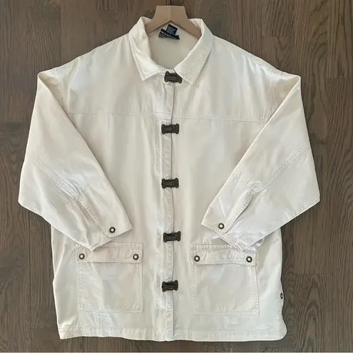 Vintage oversize dolman sleeve toggle front chore coat. In natural cream heavyweight canvas. Label is Mureli. Made in Hong Kong. 100% cotton. Size medium, measures 24" armpit to armpit, 28.5" shoulder to hem, 22" shoulder to shoulder, 18.75" sleeve from shoulder seam, 23" sleeve from natural shoulder. Brass toggle closure, two front patch pockets with brass snap closure, snaps at side of waist to allow venting, brass grommets beneath arms in front and back for venting. Is a classic French cottagecore lagenlook style, amazing layering piece. Has areas of wear and imperfections, pictured, consistent with vintage condition. No trades; bundle discount available.