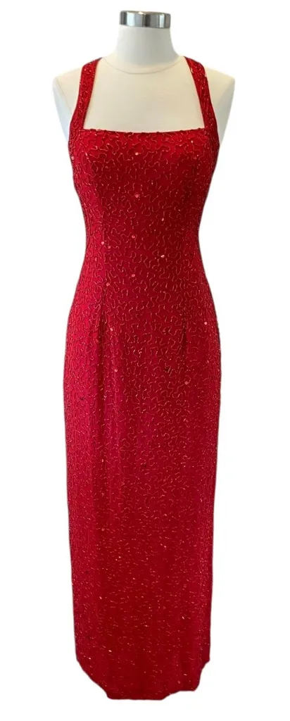 . Made from 100% pure silk with intricate red beadwork throughout. Features a square neckline, thick straps, flattering fitted silhouette, and dramatic open strappy back with slit detail. Fully lined for comfort and beautifully tailored to accentuate your shape. Perfect for formal events, galas, or as a statement holiday dress. Era: 1990’s / early 2000’s Excellent vintage condition, no notable flaws, beads are intact. Tag reads M but fits more like a modern Small due to the structured fit and non stretch fabric. Pit to pit: 14.5-15 Length: 56.5” Last image can be used for fit and style reference! vintage, 90s, Y2K, formal dress, evening gown, beaded silk, red gown, holiday party dress, prom, pageant, open back, retro glam, open back, backless gown, hand beaded, New Year’s Eve dress, 100% silk