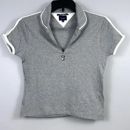 Listed is a vintage Tommy Jeans Tommy Hilfiger crop top shirt, heathered gray, double stripe shoulde... Show more
