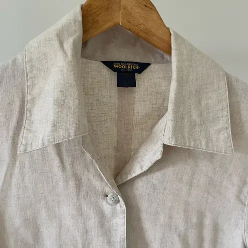 Vintage Woolrich Linen Collared Button Up Chore Jacket in Beige Washed & ready to wear✨ Adorable Woolrich super lightweight jacket with collar and front pockets. Semi cropped, such a cute fit! Women’s size medium modeled on a size small. 70% cotton/30% linen. Excellent vintage condition, some very light pilling. Measurements: Length - 25 inches Chest - 20 inches across Excellent vintage condition, some very light pilling.