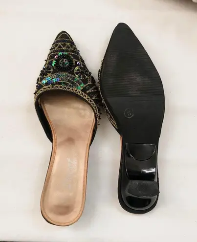 *bought on here, never worn, re-listing because I never grab them. They are beautiful, the heel on one is broken off but nothing glue couldn’t fix* Vintage Y2K Whimsygoth Gothic Gold Green Brown mules pumps sandals kitten heels sequins & beading #evening #party Size 6 Great for formal occasions & casual outings Comfortable &stylish