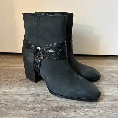 Vionic Carnelia Block Heel Bootie Black; brand new never worn Water repellent with an on-trend nod to western, this above-ankle style has tooled-leather detailing and a comfy stacked heel. Weather-Resistant Upper: Treated with a protective coating to help against inclement weather. Upper: Nubuck. Footbed: Injected Microfiber Covered EVA. Outsole: Rubber. Zipper for easy on-off. Heel Height: 3.25″. Shaft Height: 5" No box included *This item may tagged with a security ribbon and unique ID number to prevent fraudulent returns. It can easily be removed with scissors. Once the ribbon is removed, the item will no longer be in the same condition as it was sent. Additional photos and video of packaging process may be taken prior to shipment. *All sales are final. Cancellations/returns are not accepted if the color or fit does not match your expectations. Measurements are noted in the description. *Please ask questions if you need any clarification before purchasing. Tags: rain, western, neutral, black, comfort, support shoes, suede, cowboy, yeehaw, rodeo, barn, cowgirl